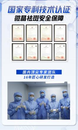 纳米微晶技术于2003年立项,由高云华教授专业团队历经多年的匠心研发打造,目前已经处于世界领先水平,2020年更是被《科学美国人》评为有望改变世界的十大新形技术,2023年入选《2023药物递送白皮书》,先后更是获得了多项国家专利认证。主要解决了涂抹类护肤品渗透吸收率较低的难题,纳米微晶技术的渗透吸收方式比较独特,将能够有效祛斑的应用成分用可溶性微晶包裹,塑造成富士山形状的晶体,当使用微晶祛斑贴的时候,可溶性微晶破裂使精华成分沿毛孔毛囊的小通道进行吸收,或者纳米微晶以及包裹的精华成分与角质层的脂质结构水分子相互融合,溶入、分散、释放到皮肤,达到分子和细胞级的修复、治疗和滋养。