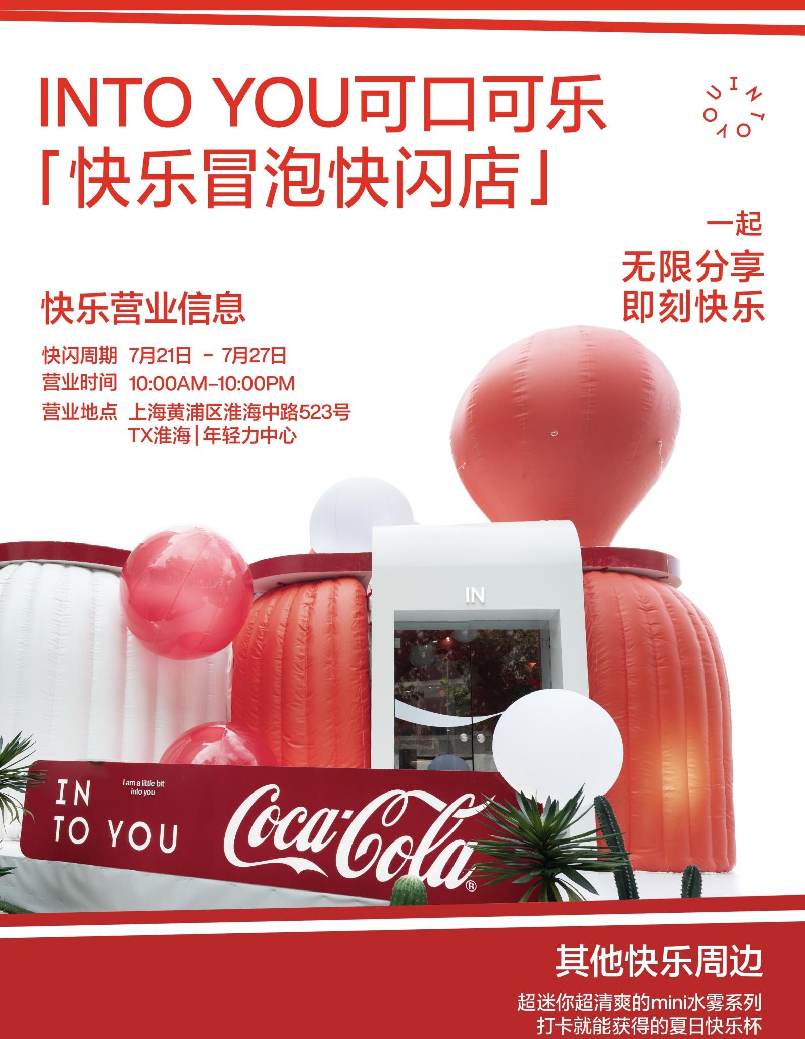 以“快乐冒泡”为设计主题,INTO YOU在上海市黄浦区TX淮海打造了为期一周的INTO YOU x可口可乐联名主题快闪店,快闪店整体空间共分为灵感气泡、色彩工厂、梦想之地三个区域。消费者不仅可以体验联名产品的妆感与色彩,还可以和朋友在自拍区进行自拍,记录下友情的快乐瞬间。