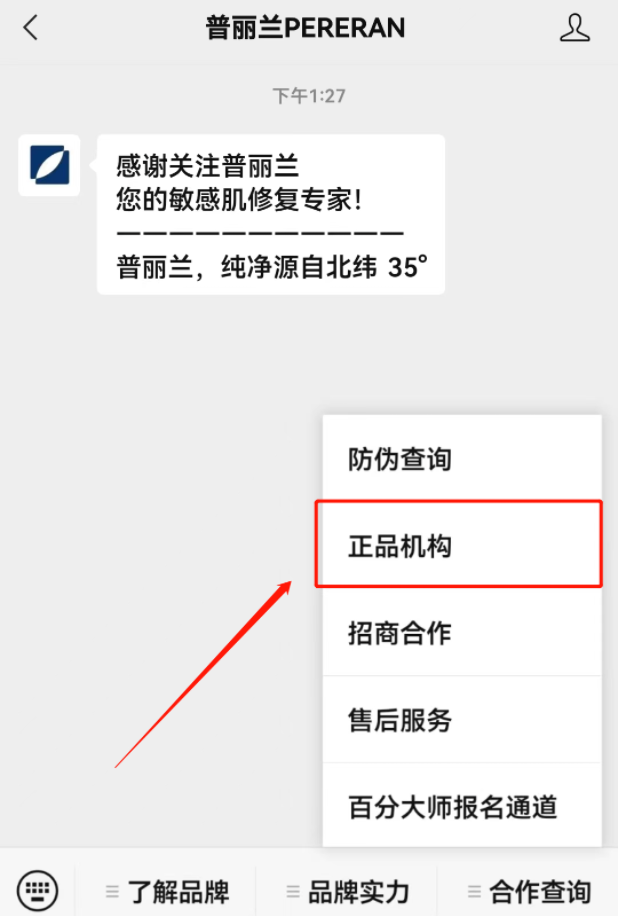 ①搜索并关注“普丽兰PERERAN”公众号